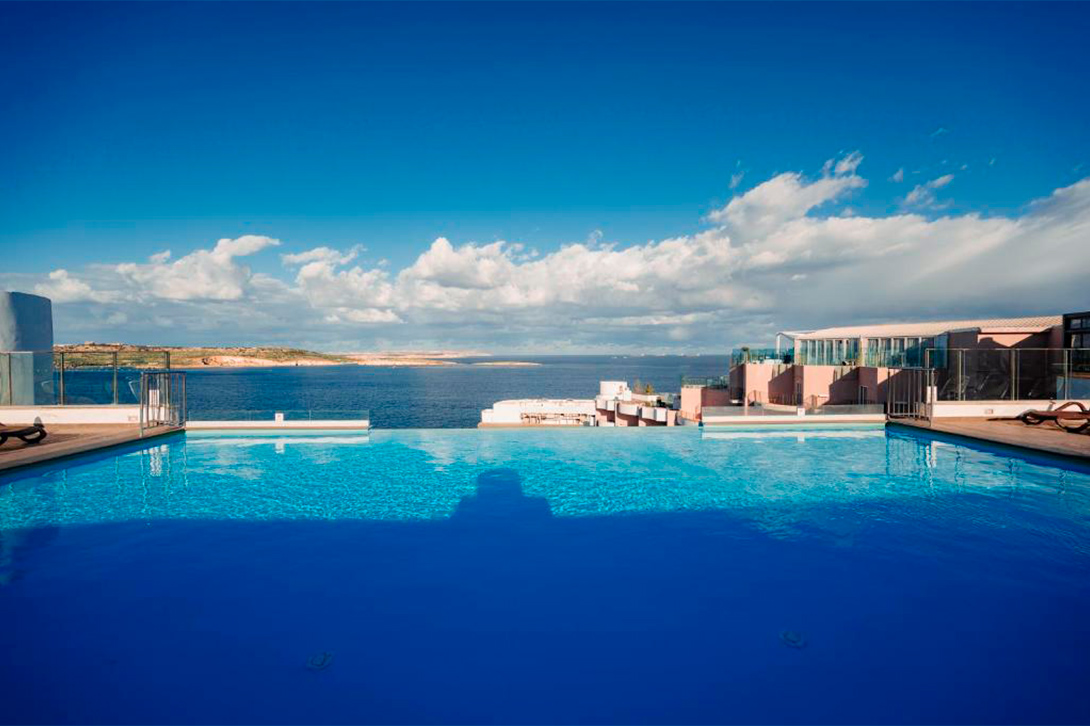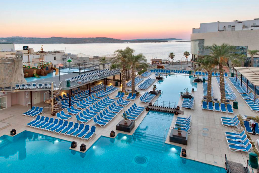 The hotel offers four pool options: a large main outdoor pool, a dedicated children's pool, a year-round heated indoor pool and an adults-only rooftop infinity pool with panoramic views over St Paul's Bay. The rooftop pool and Taza Sky Bar together make for one of the most scenic spots in the hotel, particularly at sunset.