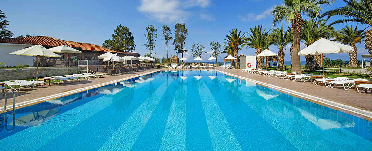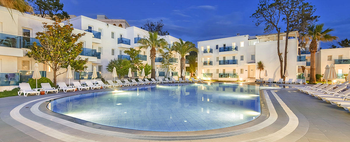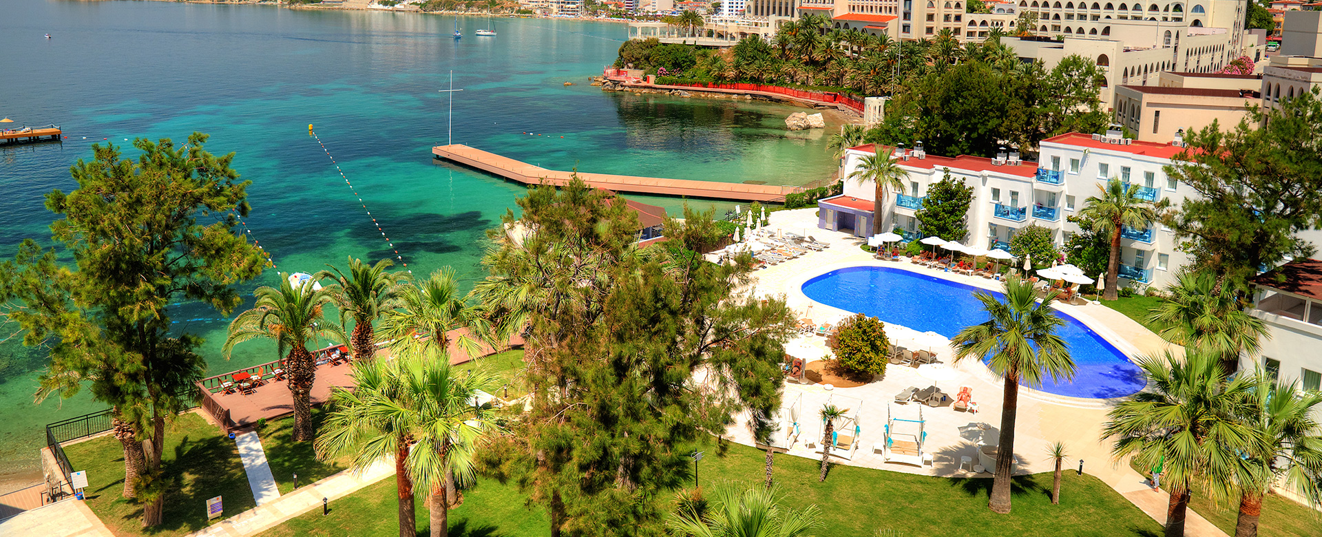 Boasting stunning views out to the beautiful Aegean Sea, this luxurious beach resort is ideally located on a peninsula at the end of Ladies Beach and at just 3 km from the centre of Kusadasi.