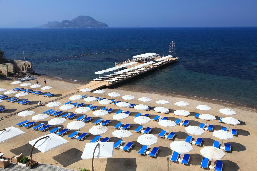 The suite hotel features a range of facilities including a spa, indoor pool and an attractive outdoor complex with pools, private beach and wooden jetty. Changing cabins are available by the pools and beach. The centre of Turgutreis is a 5-minute car ride away and the cosmopolitan resort of Bodrum is at 20 km. Closer to the complex is the pretty fishing village of Gumusluk, less than 10 minutes away by car.